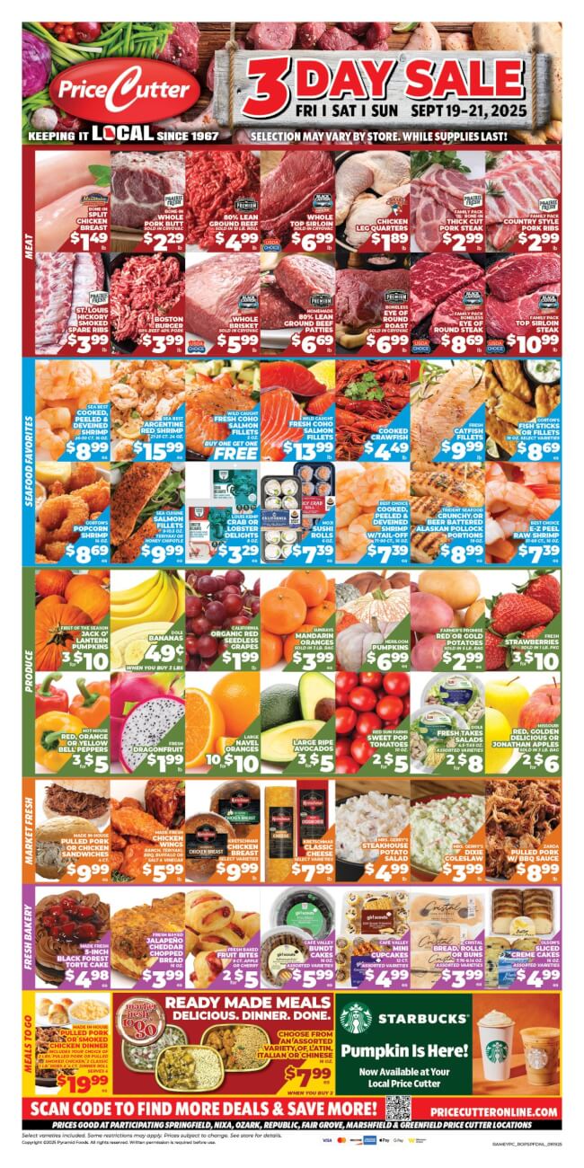 Find fresh savings Friday-Sunday Sept 19-21, 2025 Available exclusively at your Springfield, Nixa, Ozark, Republic, Fair Grove, Marshfield & Greenfield Price Cutter locations.